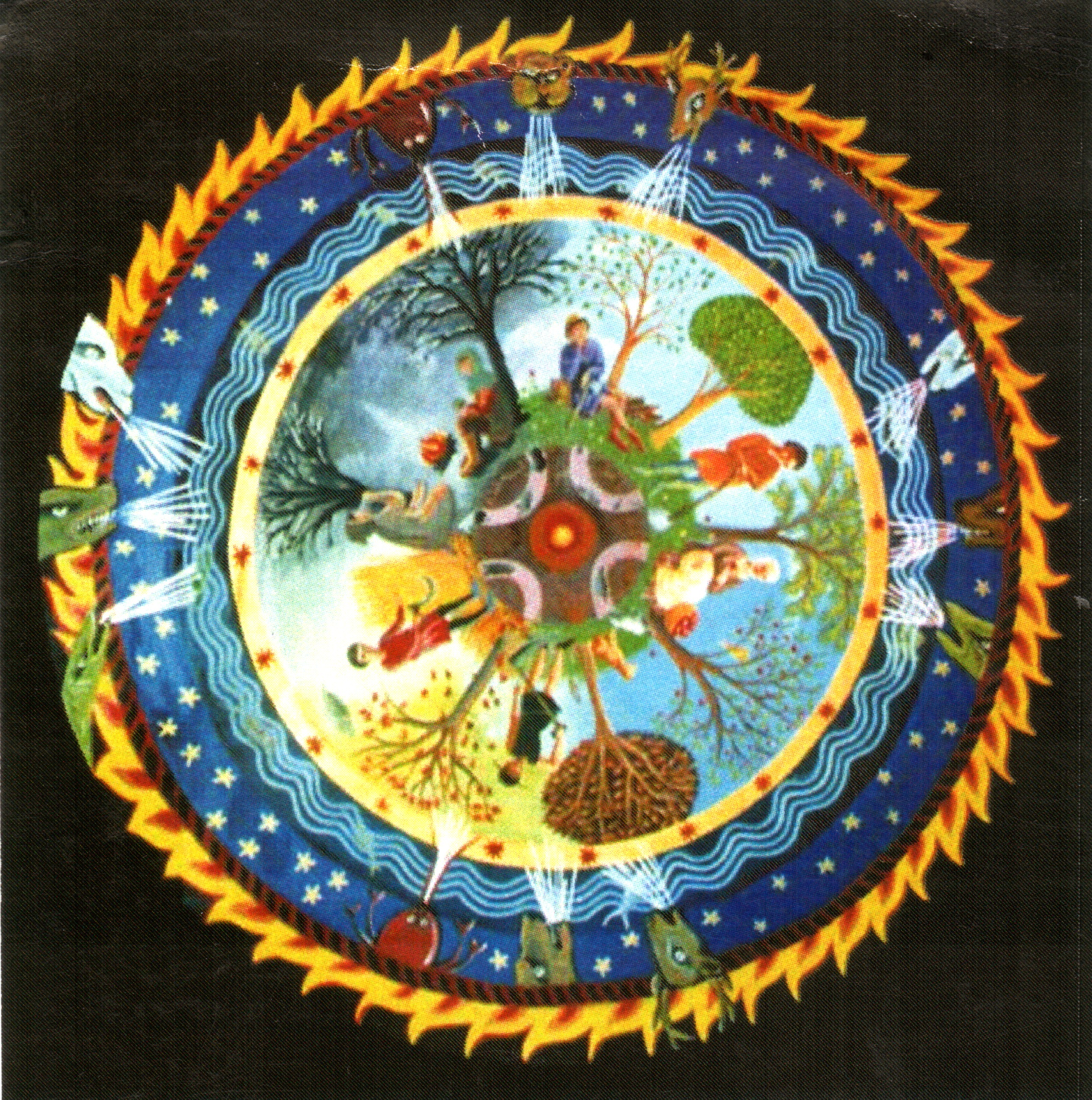 The necessity to earn enough to support seven people forced me back into full-time school teaching – but not, luckily, in a state school, where my musical loves would not have matched expectations, but in a Steiner school in South Australia. My discovery of Steiner education is one of the most delightful things to have come from that period of difficulty. At last I had discovered a school system whose fundamental premise matched my long-held belief that music, especially singing, is a gateway to the opening of the soul, and must be given to all children. So while my visual art self foundered, my music education self found a huge new need which I took great delight in trying to meet. In 1991 I had been commissioned by Orana Steiner School in Canberra to create a book of songs for use in Steiner Schools - this led to the creation of two books: "Songs of the Tree of Life": volume 1 "The Early Years" (1998) and volume 2 "The Middle Years" (1996). I painted the cover for volume 2 in water colour; the smaller volume 1 has a pencil drawing of the same tree.